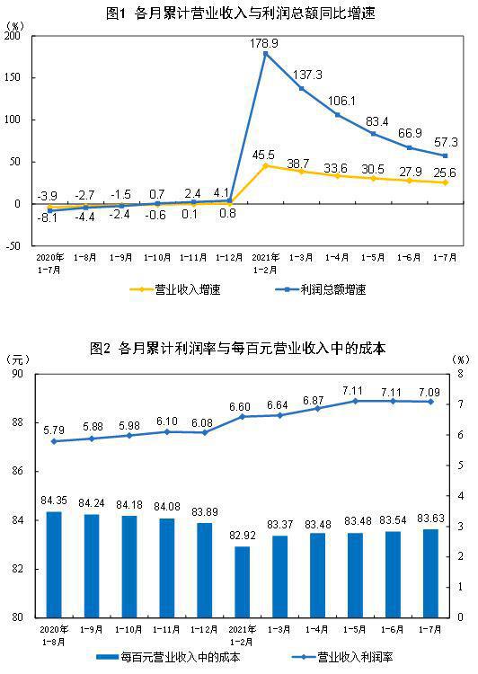 1—7月份,全国规模以上工业企业实现利润总额49239.5亿元,同比增长57.3%(按可比口径计算,详见附注二),比2019年1—7月份增长44.6%,两年平均增长20.2%。