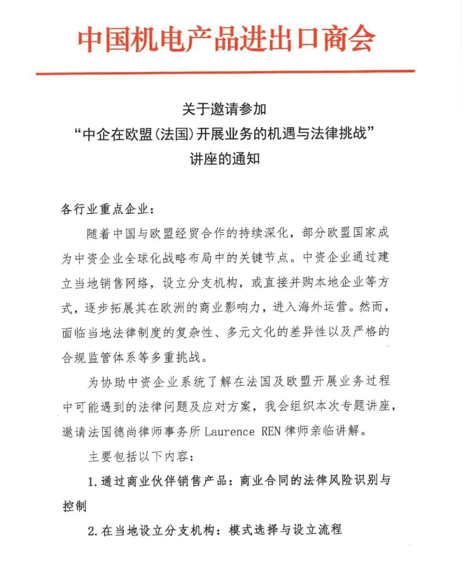 为协助中资企业系统了解在法国及欧盟开展业务过程中可能遇到的法律问题及应对方案,我会组织本次专题讲座,邀请法国德尚律师事务所Laurence REN律师亲临讲解。