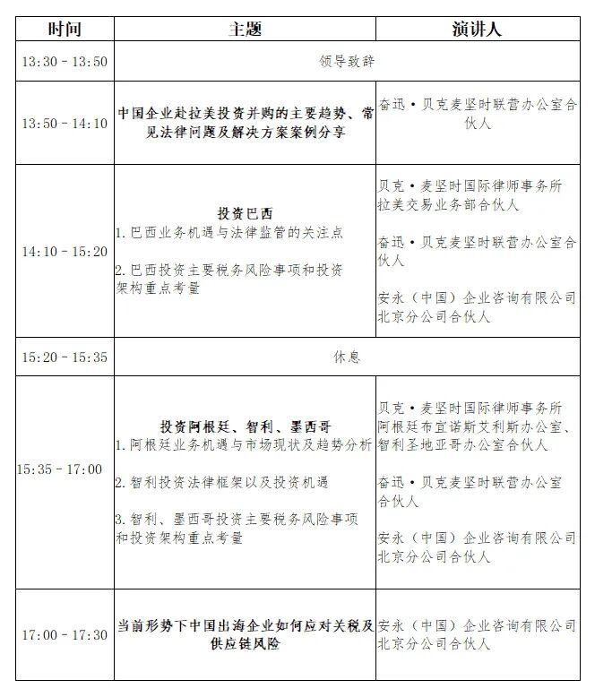 高质量共建“一带一路”倡议实施以来,中拉贸易额持续高速增长,拉美地区已成为中国企业出海投资的第二大目的区域。为帮助中国企业在对拉美投资过程中规避潜在法律和税务风险,成功落地拉美市场,中国机电商会拟联合中国上市公司协会、奋迅·贝克麦坚时联营办公室和安永华明会计师事务所(特殊普通合伙)于2025年9月16日(星期二)下午在北京王府半岛酒店共同举办中国企业“走出去”机遇与挑战研讨会(拉美专场)。本次会议将针对中国企业出海拉美涉及的法律监管与合规、跨境并购、项目融资,以及跨境税务规划等相关法律和税务问题进行深入分析与讲解。议程安排见文末。