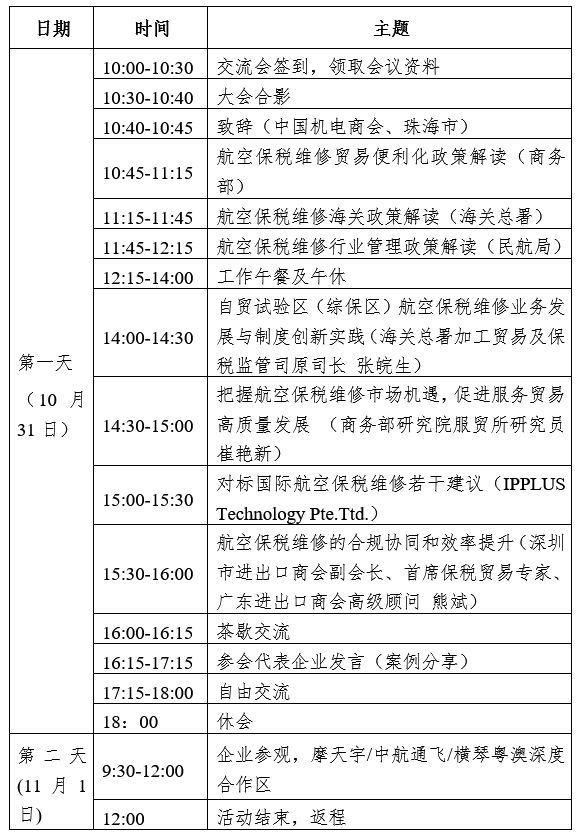 为落实政策指引,促进航空保税维修业务高质量发展,拟于2025年10月31日至11月1日在珠海市举办“2025年航空保税维修高质量发展工作交流会”,搭建政府、保税区域、海关、航司和航空维修关联企业间的互动交流平台;提升保税维修在航空产业发展中的影响力,加强业内人士的沟通合作,共同商讨新时期航空保税维修产业发展的新驱动和新未来。