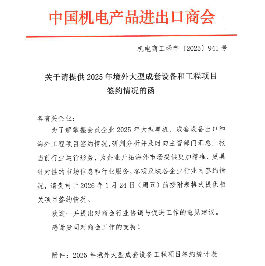 为了解掌握会员企业2025年大型单机、成套设备出口和海外工程项目签约情况,研判分析并及时向主管部门汇总上报当前行业运行形势,为企业开拓海外市场提供更加精准、更具针对性的市场信息和行业服务,客观反映各企业行业内签约情况,请贵司于2026年1月24日(周五)前扫描二维码下载相关表格,并按附表格式提供相关项目签约情况。