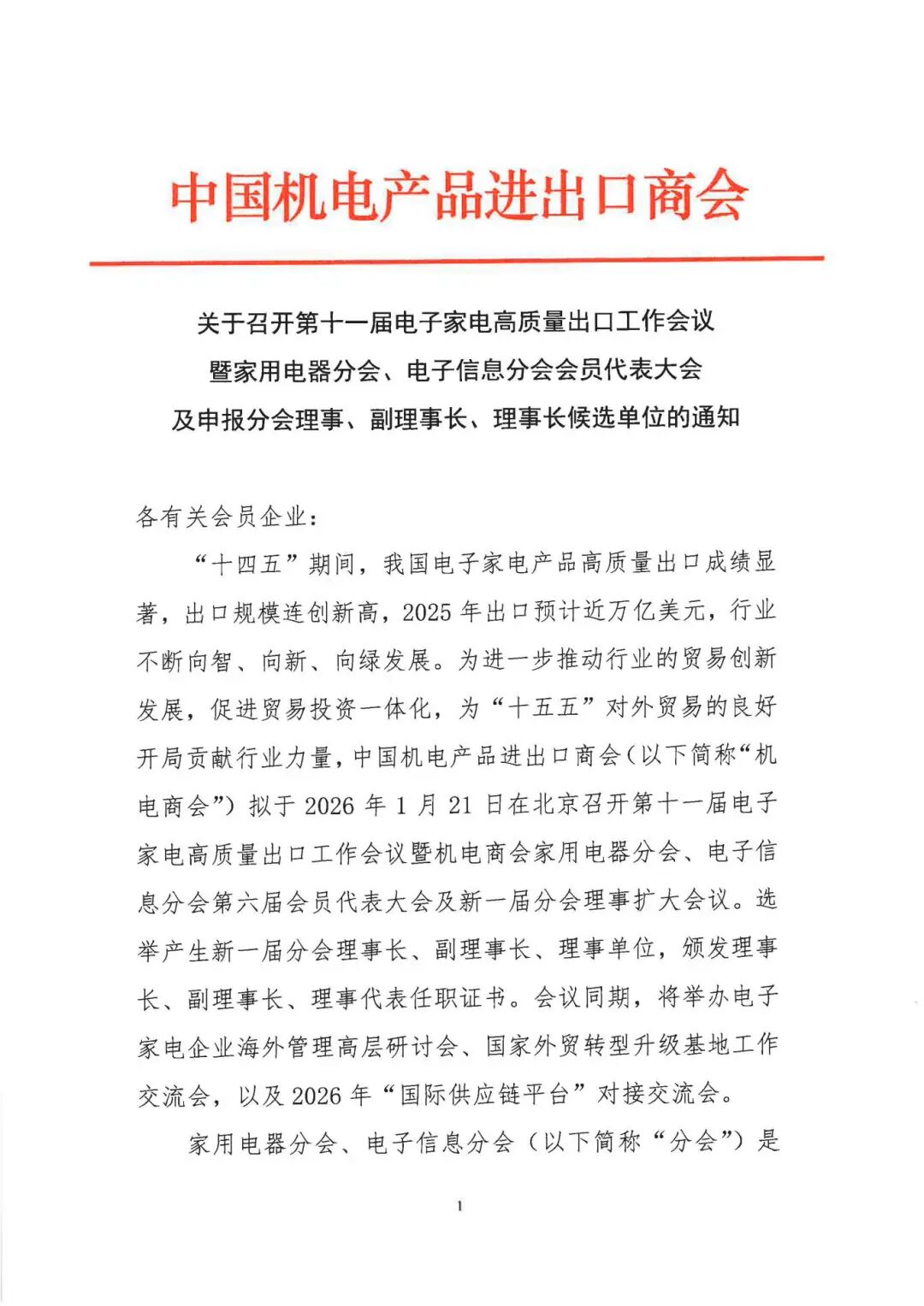 “十四五”期间,我国电子家电产品高质量出口成绩显著,出口规模连创新高,2025年出口额预计近万亿美元,行业不断向智、向新、向绿发展。为进一步推动行业贸易创新发展,促进贸易投资一体化,为“十五五”对外贸易的良好开局贡献行业力量,中国机电产品进出口商会(以下简称“中国机电商会”)拟于2026年1月21日在北京召开第十一届电子家电高质量出口工作会议暨中国机电商会家用电器分会、电子信息分会第六届会员代表大会及新一届分会理事扩大会议。会议将选举产生新一届分会理事长、副理事长、理事单位,颁发理事长、副理事长、理事代表任职证书。会议同期,将举办电子家电企业海外管理高层研讨会、国家外贸转型升级基地工作交流会,以及2026年“国际供应链平台”对接交流会。
